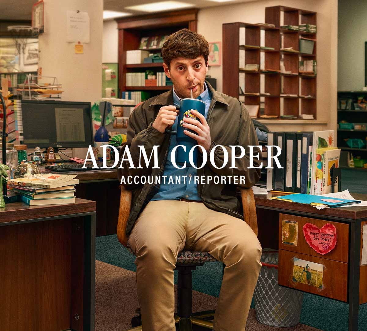 - Alex Edelmam ricopre il ruolo di Adam, un adorabile imbranato e un marito stressato, con quattro figli e zero abilità. Ha uno stile di reportage stravagante che si qualifica come ‘quasi notizie’.
